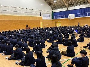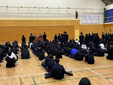 ■「正月にも行われていた駅伝大会に例えると、1学期にスタートし、2学期に皆で苦労を乗り越えた後の3学期はまさにゴールに向かう時期。仲間とともに失敗や苦難を乗り越えてゴールを目指そう」という学校長からの話の後、学年代表から3学期の抱負が述べられました。「計画的に学習に取り組んで、苦手を克服したい」(1年生)「時間を大切にし、バランスよい生活を心がけたい」(2年生)「残り少ない時間を友達と有意義に過ごしたい」(3年生)と新年の抱負が述べられました。