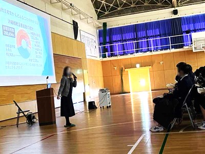 ■全校生徒と保護者の皆さんが、先の大戦で、沖縄ではどのようなことが起こっていたのか、講師の先生からいろいろなデータや、聞き取りの内容を聞かせていただくことができました。