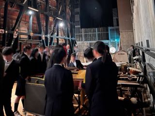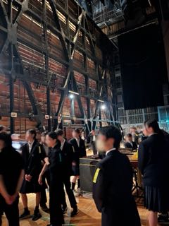 ■今回の会場は、大きなステージを備えていますが、舞台裏もかなりの広さと高さを備えています。まさに『見上げんばかり』という言葉がふさわしい広大なスペースです。しかし、他校の演奏中は物音ひとつ立てずに待機しています。演奏者の演奏を邪魔しないというマナーは会場だけではなく舞台裏にも徹底されています。
