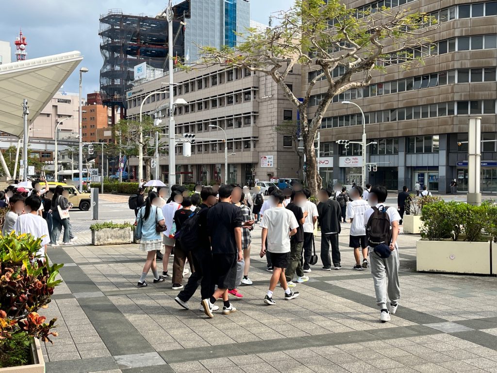◾️修学旅行3日目の最後の訪問地は、日本各地から観光に訪れる人、また、世界各国から訪れる人々で賑わう『国際通り』です。沖縄県庁前からの通りとなります。