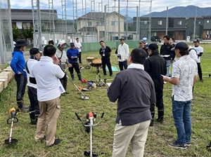 ■運動場の周りの除草のために草刈り用の機械を持ってきていただいた皆さんには、湯田地域づくり協議会の方からミニ講習会も実施していただきました。安全に関する心構えは決しておろそかにはできません。